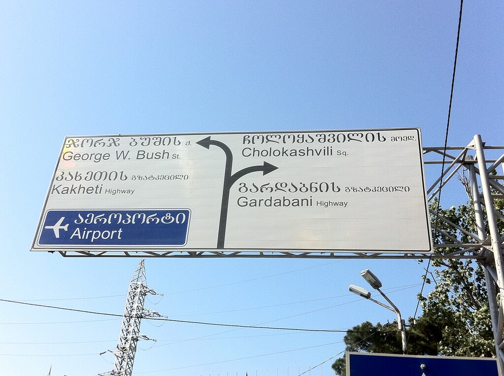 For dinner, we’d planned to go to Shemoikhede Genatsvale – a local Georgian chain serving khinkali (dumplings) and other local specialties. But, in order to get there, we got our first experience of the Tbilisi metro. Very cool, and confusing, since all the signs were in Georgian. We got to ask the little old ladies who were working which way to go, etc, in Russian, and I had a great time. Yes, again, I admit to being a total geek. So, onto dinner. This proved to be an awesome decision, and we were treating to the typical georgian dish after dish. It was great, because our waitress was a real character, who was anxious to show off the few words of English she knew “only know chicken, milk” and was lots of fun. Between her English and my Russian we got a great meal, a fun bottle of local wine, and it was a great local experience. Plus, the restaurant had a really cool sign out front!