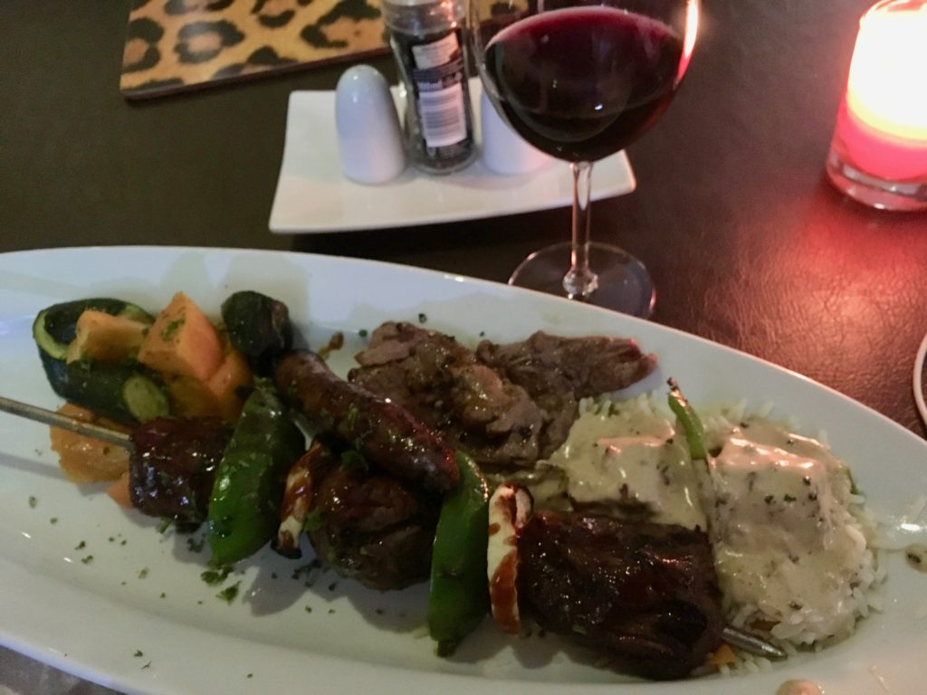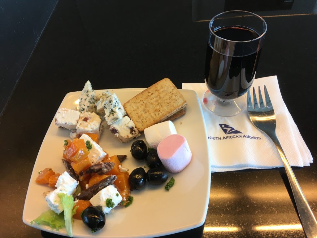 Wow, now that’s what I call a meal. Just kidding…this is just the appetizers. Seriously! The red wine on board was marginally better. We had multiple kinds of bread on a plate. Upgrade from peanuts to cashews this flight. A nice little cucumber/tomato/cheese salad. Cheese plate. Meat plate. Fish plate. Whew.
