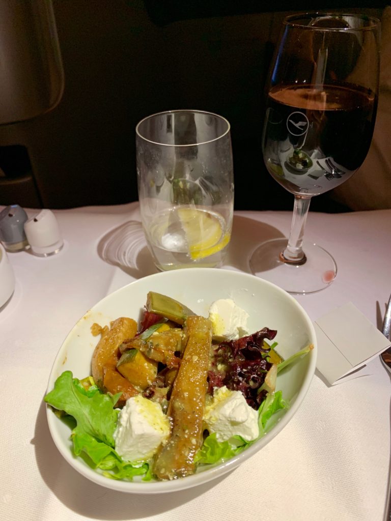 A salad was offered separately (wow, a multi-course meal in business!) which was really tasty with feta cheese and roasted vegetables. Small, but one of the best appetizer salads I’ve had in business class in quite some time!
