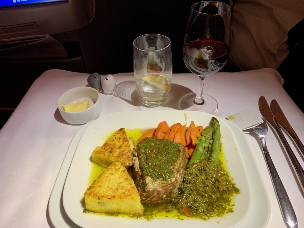 Grilled beef with chimichurri sauce, asparagus, and polenta. I still don’t understand the recent fascination airlines seem to have with polenta, but maybe it’s trendy again?
