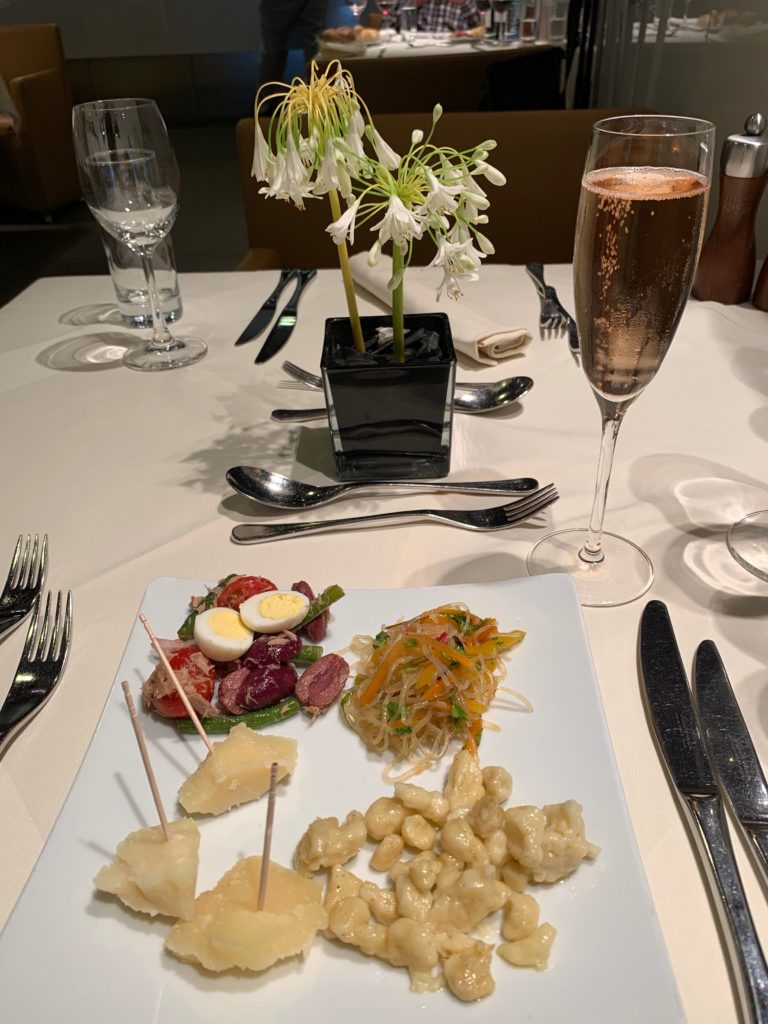 I wasn’t terribly hungry, but also didn’t want to pass up the usual deliciousness in the lounge, so grabbed a seat and helped myself to some snacks from the buffet. Mmmm quail eggs!