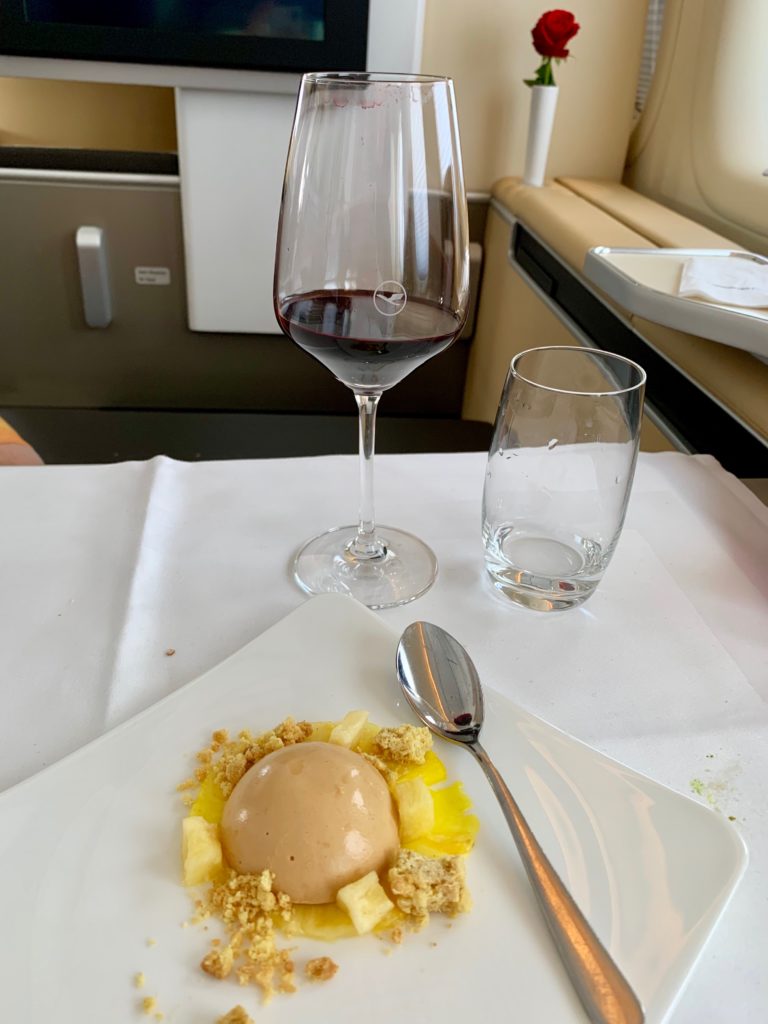 Desert was outstanding – which has been the case on many of my flights lately (with the obvious exception of United and their sundaes which are basic, but good) – iced dome of white chocolate on curried pineapple carpaccio with crumbles.