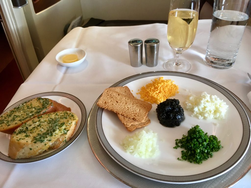 Next up was the caviar service, which scored an A+ for me for presentation. Mother of pearl spoon, amazed curved condiments tray, caviar in a classy glass jar, silver trimmed plate…it just oozed class. Well done Thai! I think this is my new favourite caviar presentation in-flight…sorry Lufthansa…I still love you!
