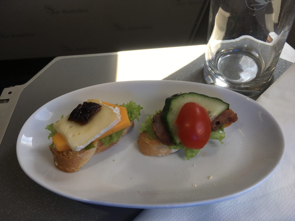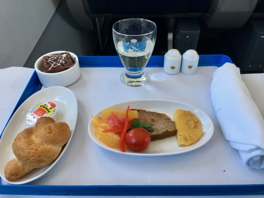 After 30 minutes after takeoff, out came the appetizer. A warm piece of what I’m pretty sure was beef, some grilled pineapple, and some orange wedges. Along with a roll…and some South African sparkling wine that was absolutely terrible. I asked to see the bottle, and was met with a “we cannot do that.” Uhhh…ok? At least it was a friendly refusal.