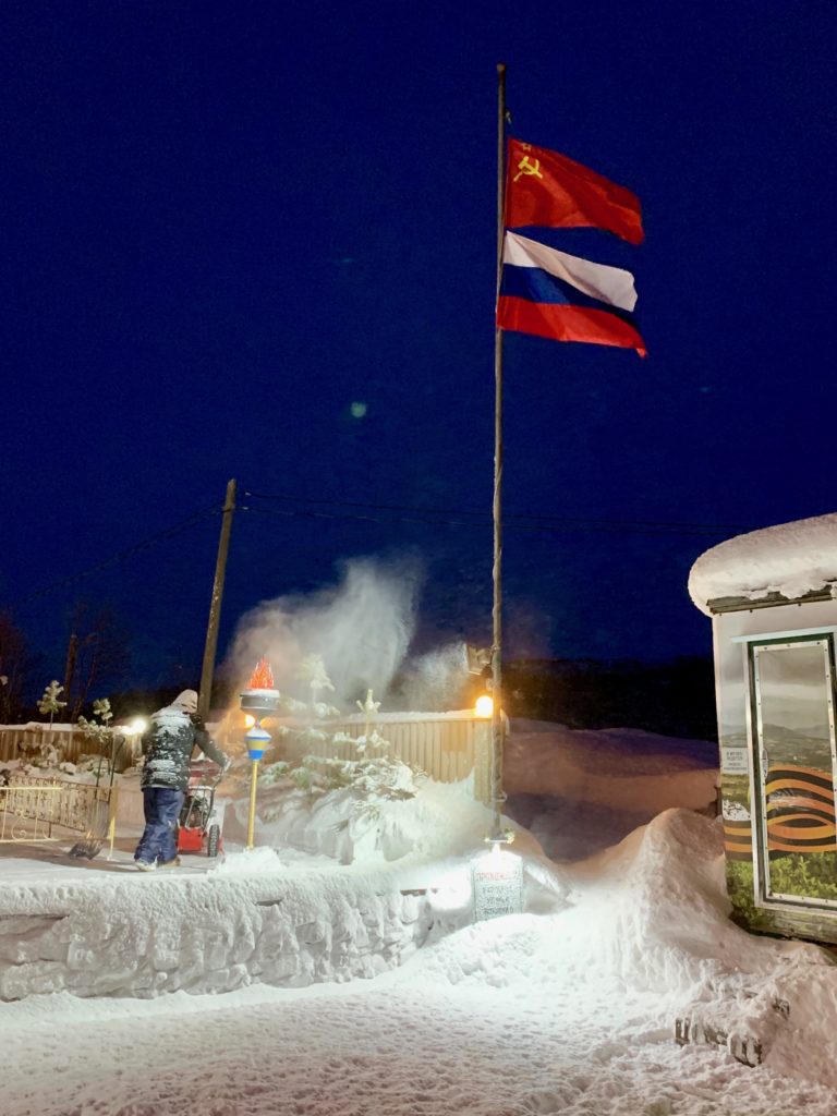 Russian AND Soviet flags still flying this far north. Love the contrast of the deep blue sky: