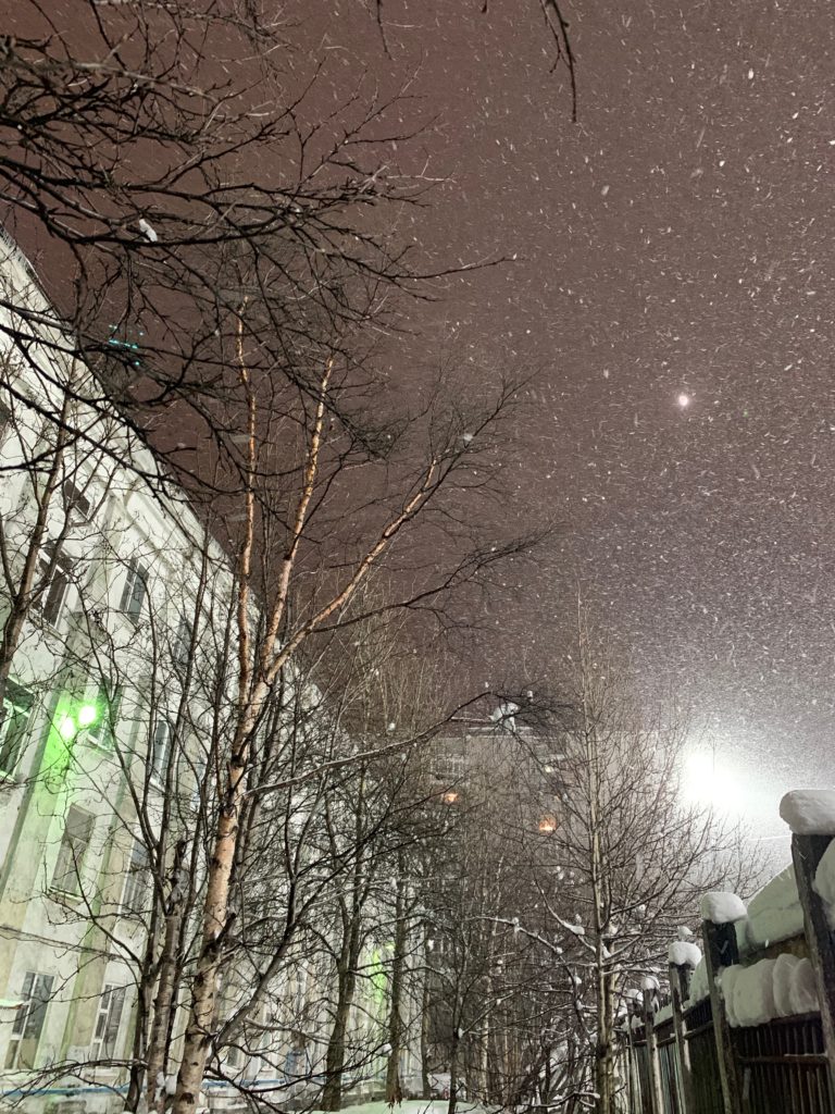 Fortunately, the minibus (which only held about 12 of us) had no trouble driving 100+ kph the whole way, despite the rather heavy snow, and we all lived to make it to Murmansk after less than four hours on the road. Bus dropped us right at our hotel, where after a quick check-in we were off to find some food. After missing lunch we were pretty hungry, so set off through snowy Murmansk. Snow was still coming down very heavy: