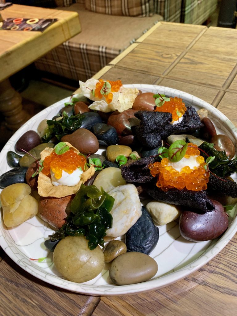 We started with the salmon caviar and soft cheese on black rice crackers, which was outstanding. Why it’s served on a bunch of stones I don’t know, but…