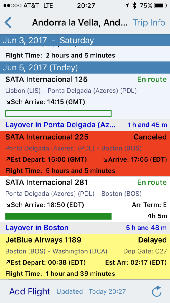 Finally, at about 3:30pm a supervisor came to the lounge and singled out me and two other passengers. Yes, the plane was still in Lisbon (duh) and won’t be here for quite some time. He had proactively rebooked me and the other two passengers on the 5pm flight. There were only three seats left, so everyone else was left to wait and hope. How we had been chosen, I’m not quite sure. I was on a full fare paid ticket, so maybe that helped, or maybe he’d seen me inciting revolution in the lounge and wanted to get rid of me.