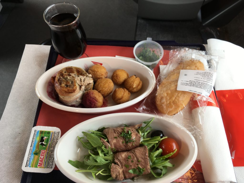 Once again, seating is 2 on the left and 3 on the right on this aircraft, which means on the left side in “business” you have an empty next to you, but on the right side only the middle between two people is blocked. Flight wasn’t full, but I enjoyed my seat 1A. Did some plane-spotting on the taxi. First time I’ve ever heard of “Iraero” – looks like they bought some of the old Transaero 777s.