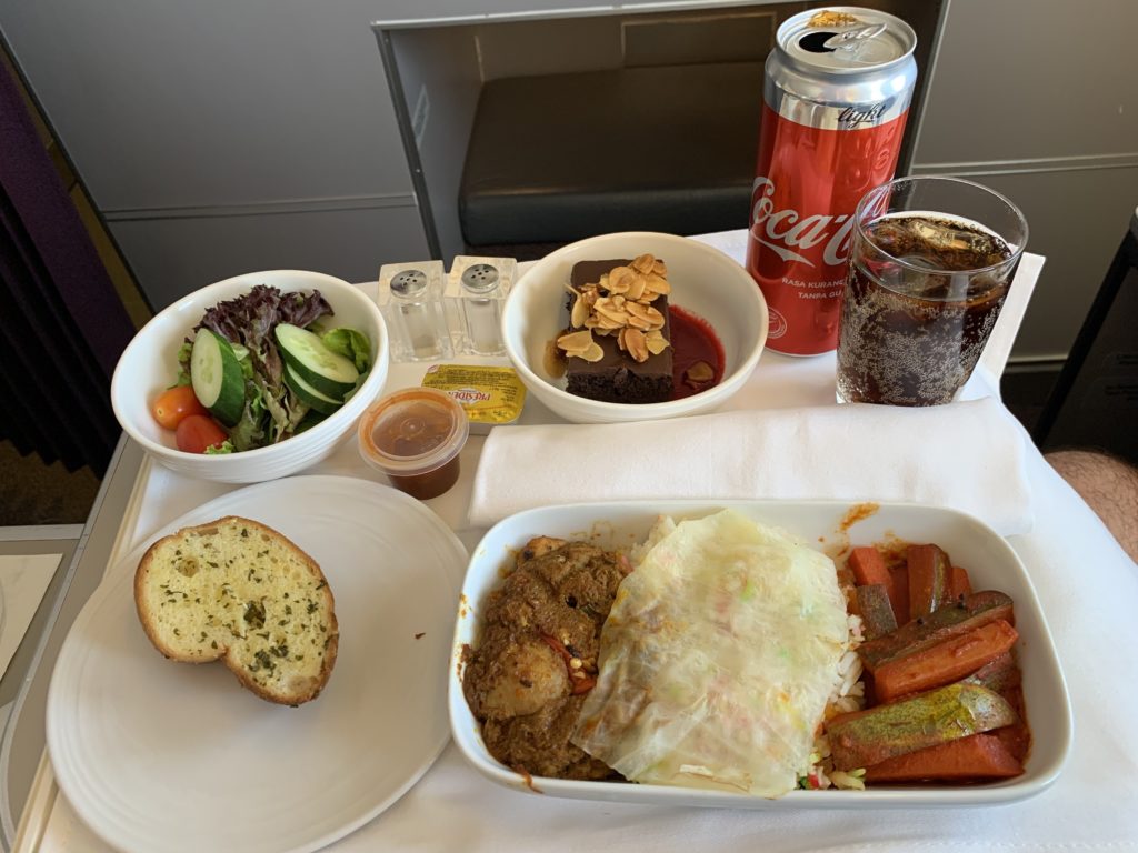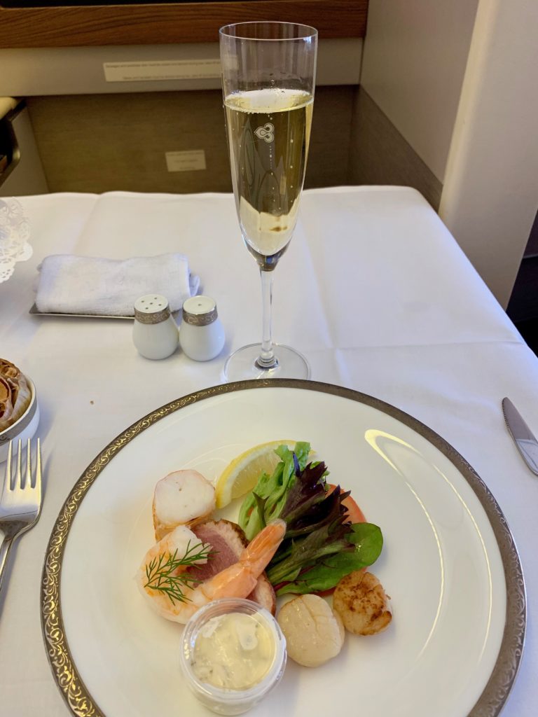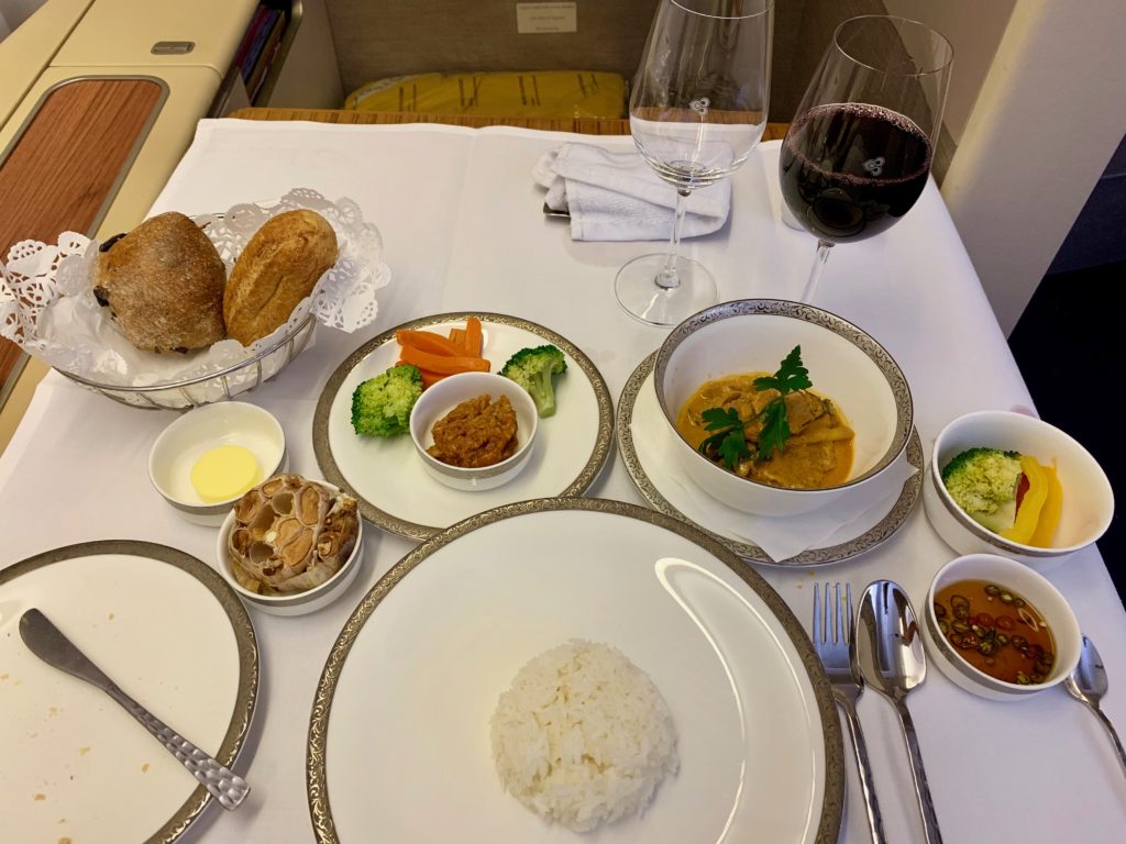 Lunch was served right after takeoff, complete with garlic bread, more champagne, and a nice thai salad.
