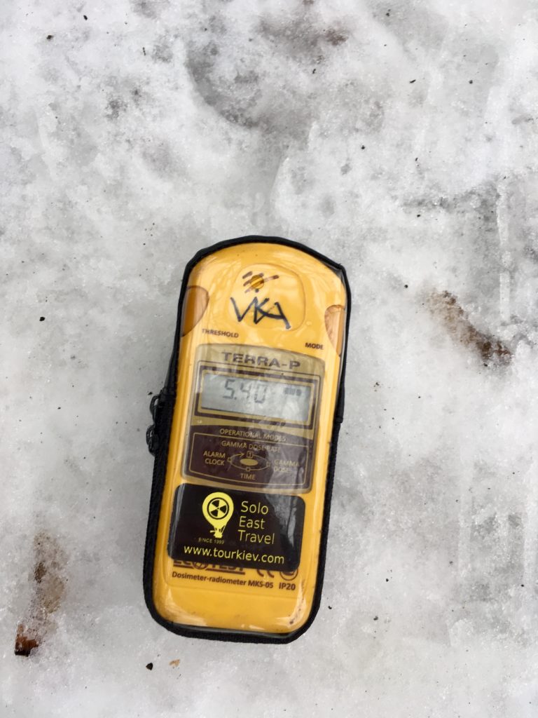 Geiger counter shows a radiation hotspot in the snow outside the kindergarten. 10-15x background radiation, but still only about 3x higher than a transatlantic airline flight.