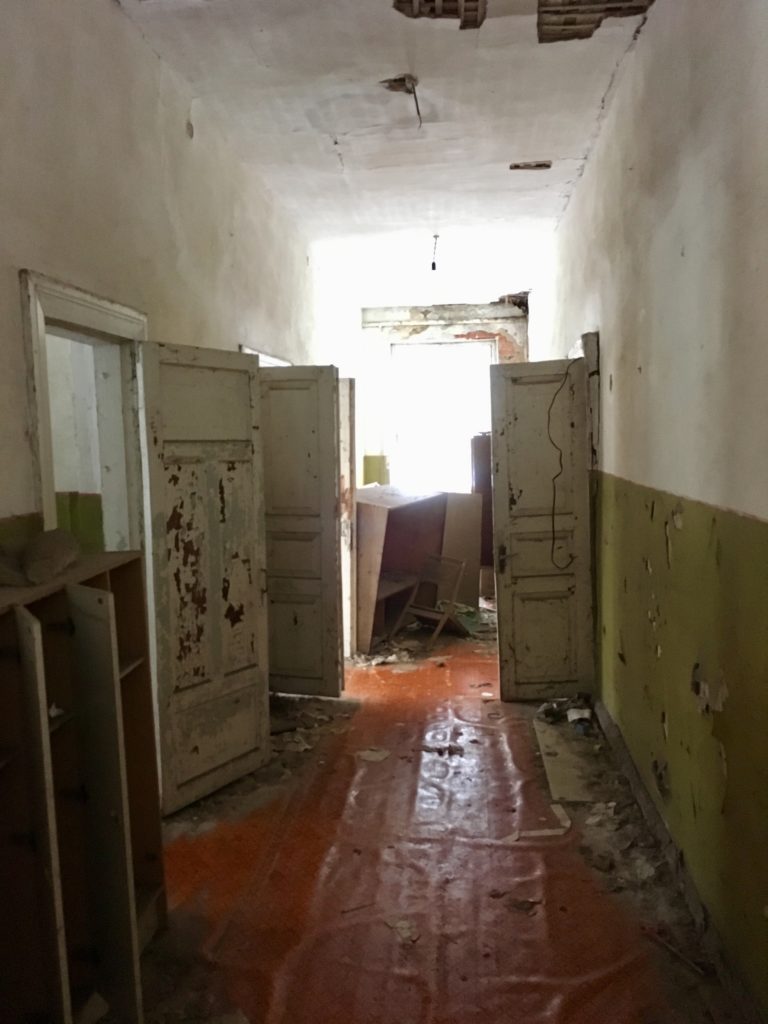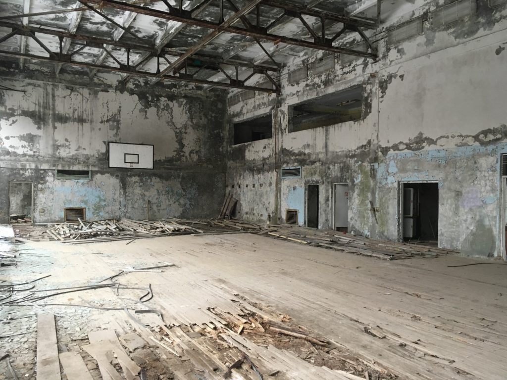Into the exclusion zone, and a stop at a small abandoned village. The town hall/meeting spot, now overgrown: