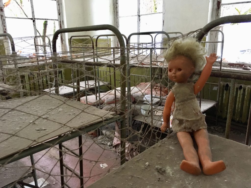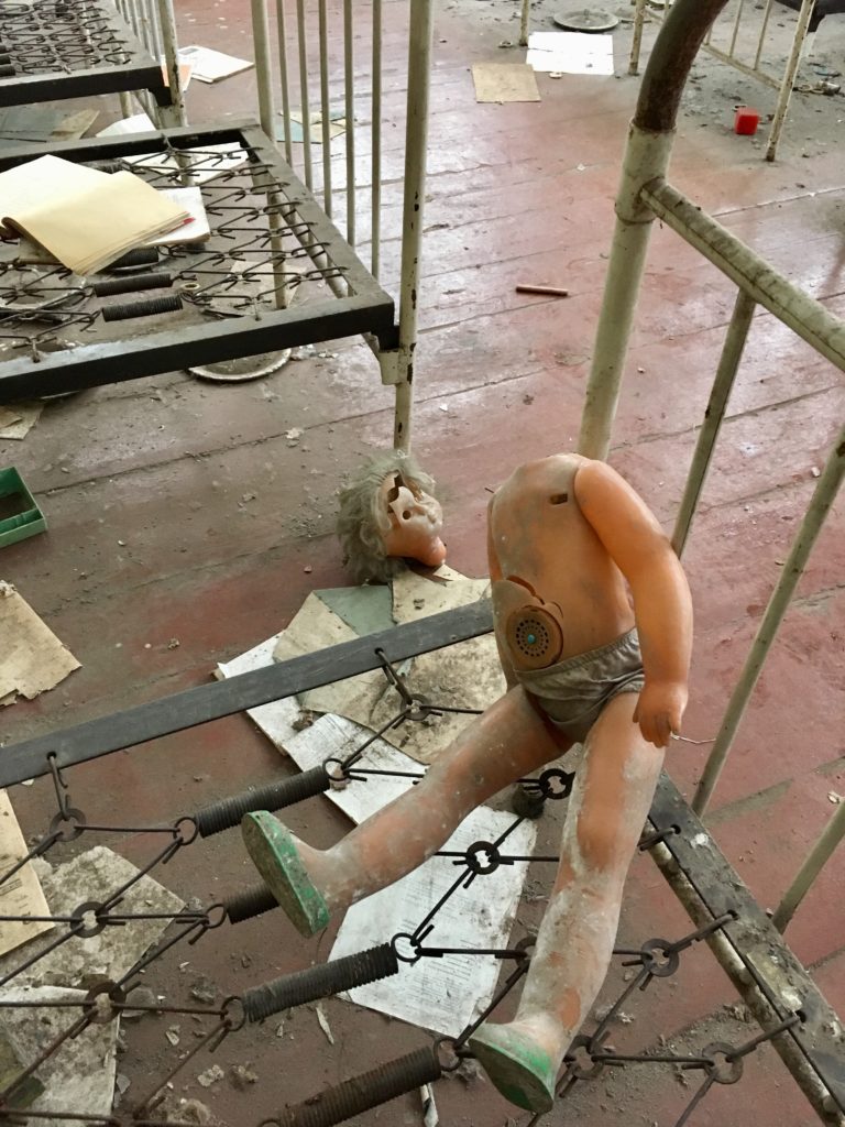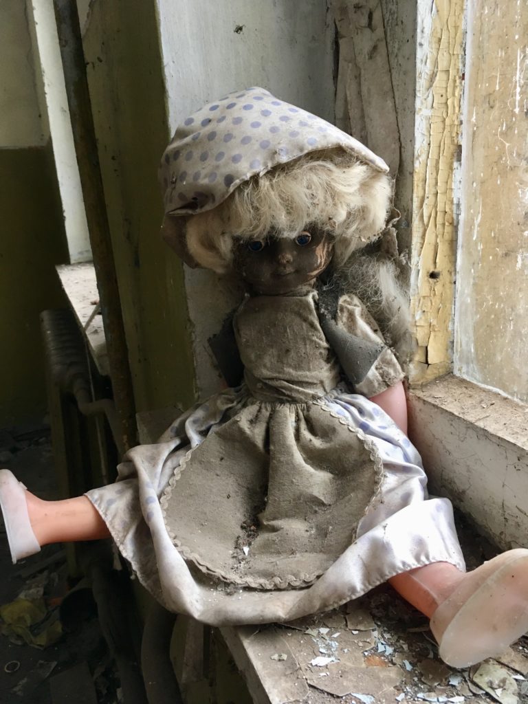 Creepy doll in the kindergarten…according to the geiger counter covered in mostly dirt, but probably a bit of radioactive soot too: