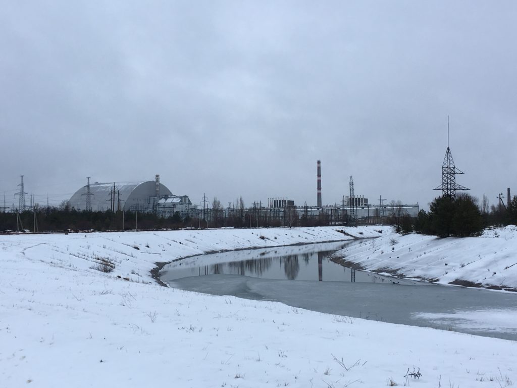 Approaching the nuclear site, with reactors one, two, three, and four. Reactor four was the one that blew and now has the domed sarcophagus over it: