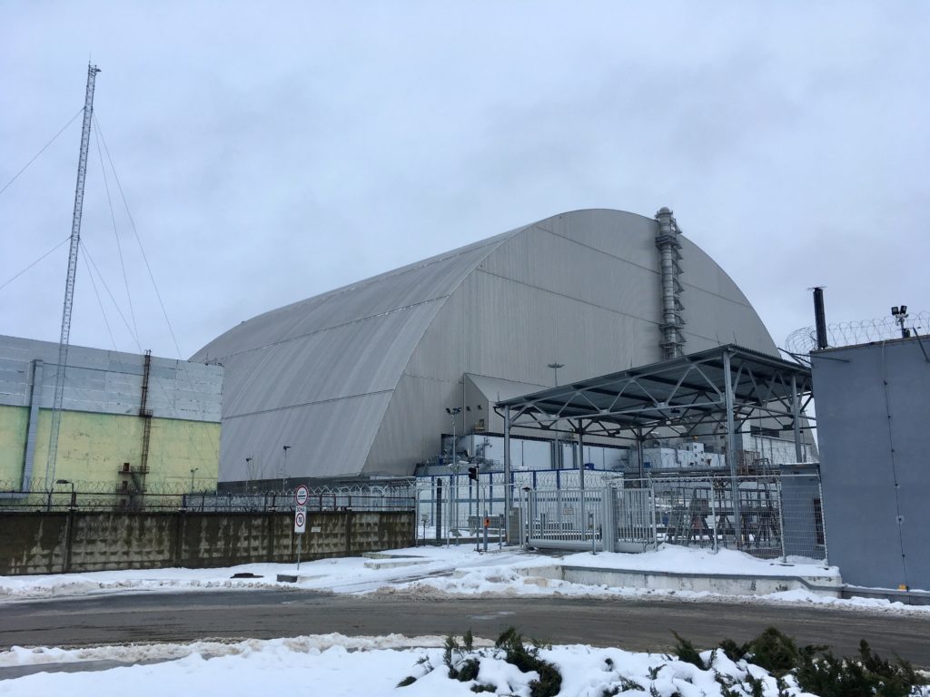A few years ago efforts began to build a more permanent solution, but there was one problem: getting within 100 meters of the reactor was still far too dangerous for more than a minute or so, so how were there going to build such a massive structure? End of the day, it was built about 100-200 meters away, and then slowly inched over the reactor on a massive series of hydraulic jacks. Great details on the “New Safe Confinement” on Wikipedia where you can read about the massive international engineering feat. Right, so here’s the new safe confinement…and also melted down reactor…from just about 80 meters away: