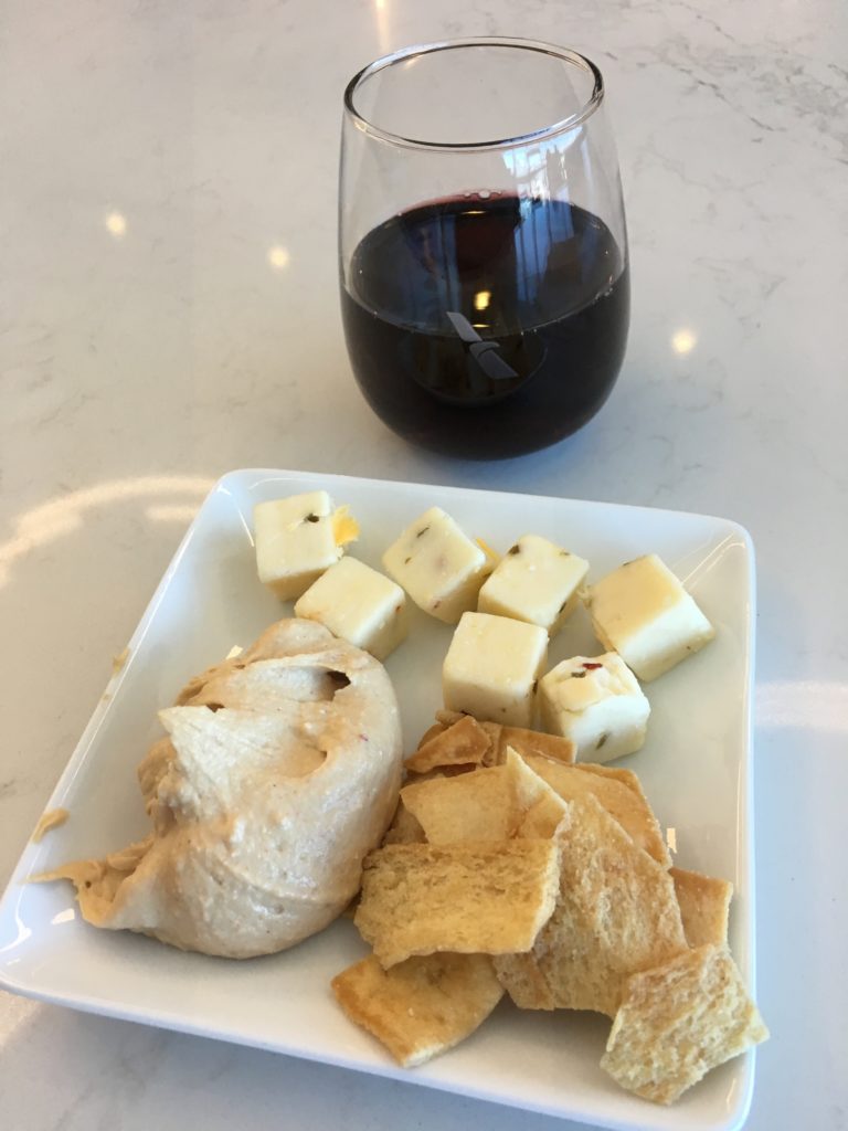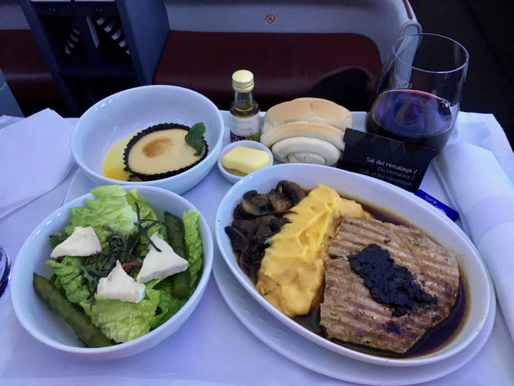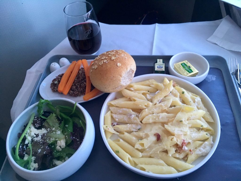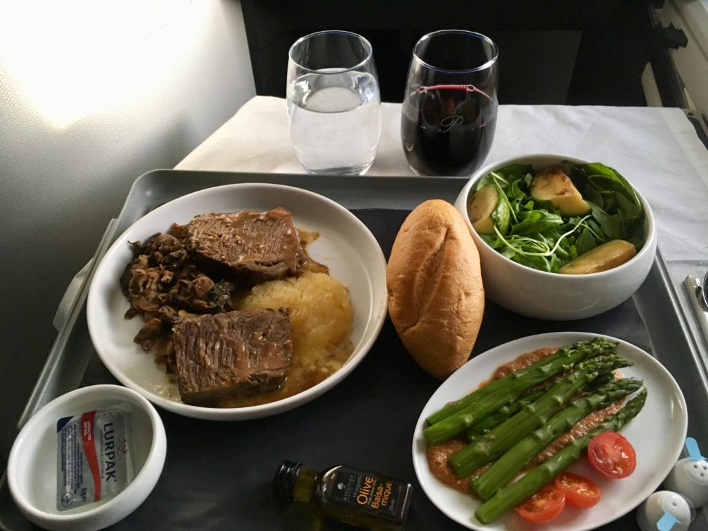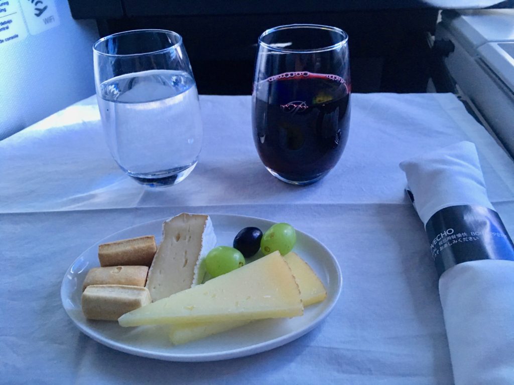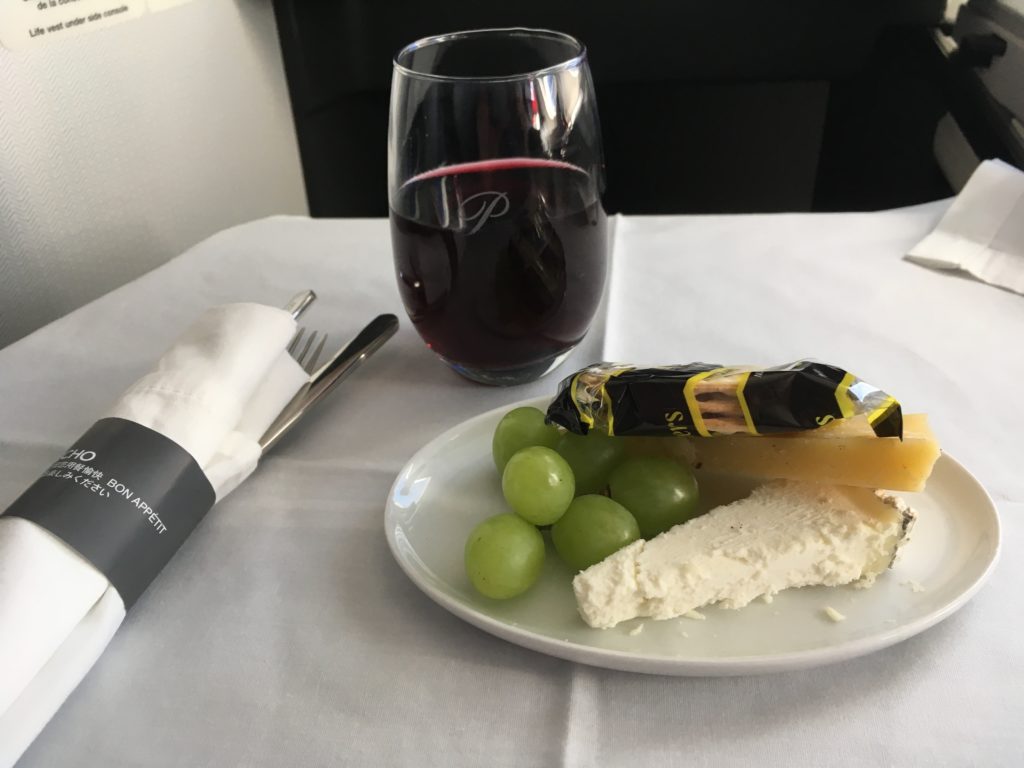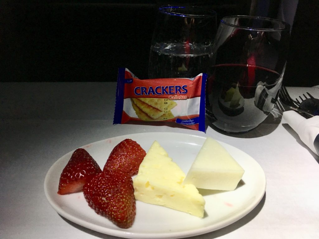 Despite being a late flight, the crew was pretty slow to spring into action. The wait, however, was rewarded with cheese as a starter again. It’s going to be really hard to go back to United and their semi-warm nuts. I’m also super fussy on my fruit, but the strawberries were perfectly sweet and delicious, and the whole combo went nicely with a glass of cabernet.