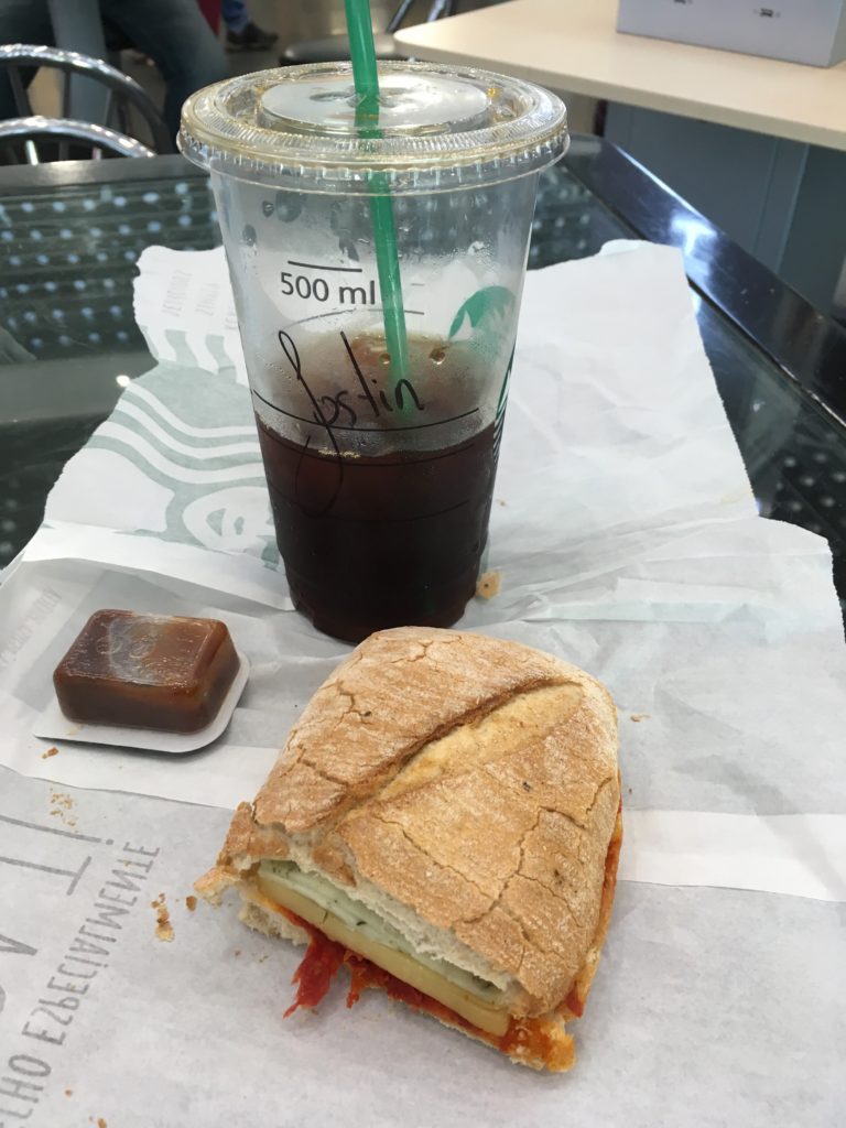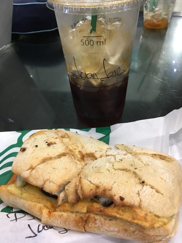 First stop after we re-cleared security was, of course, Starbucks, where Juan Jose slowly came back to life after a good strong coffee…and another helping of the delicious cheese sandwich I’ve become addicted to over the last month: