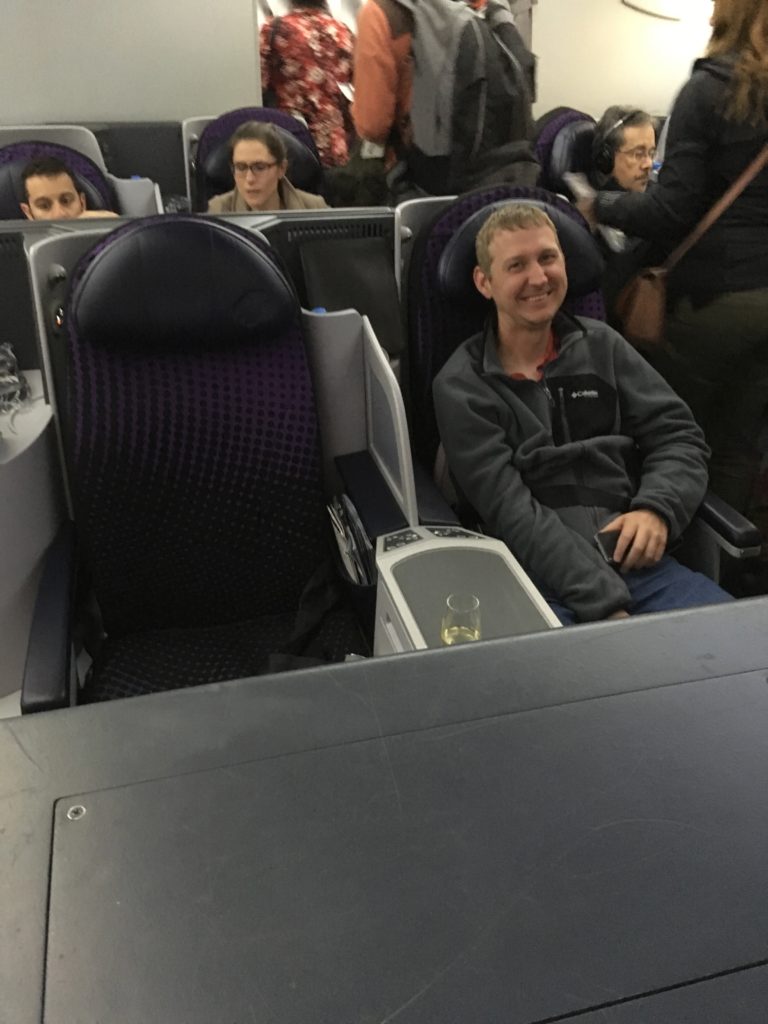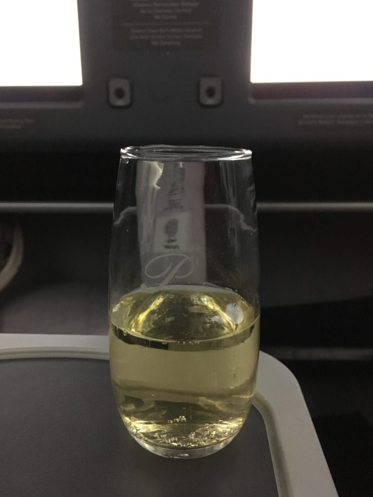 Unfortunately, no plane swap this time like we had been lucky enough with on the way down. We still had the 787-8 as planned, and the less than desirable 2-2-2 seating. We were in the middle section, so it wasn’t bad, just not nearly as nice as the 1-2-1 configuration on the 787-9. Oh well, business class problems. Decent (very small) pour of welcome aboard champagne: