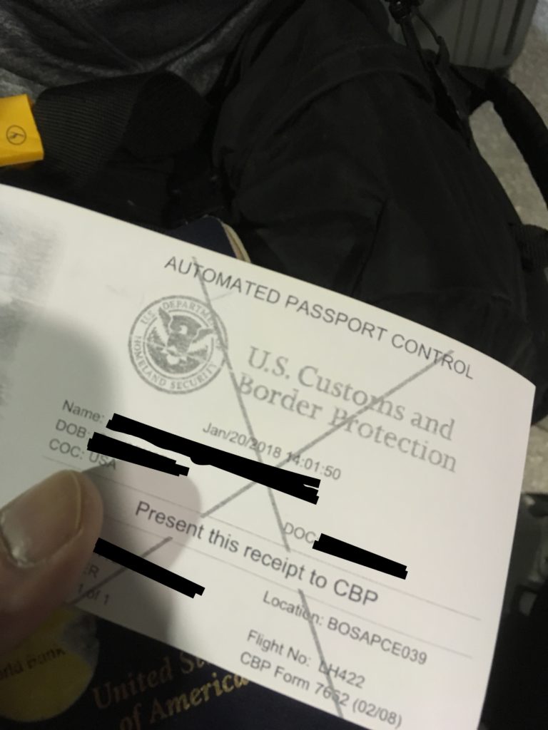 Turns out you report in at a machine now that is very similar to Global Entry, but there’s no biometric scan. You still scan your passport, the machine takes your picture, and spits out a receipt that you then get in line to show to an agent. I guess what this does is automates some of the data entry the agent used to have to do, and makes a determination.