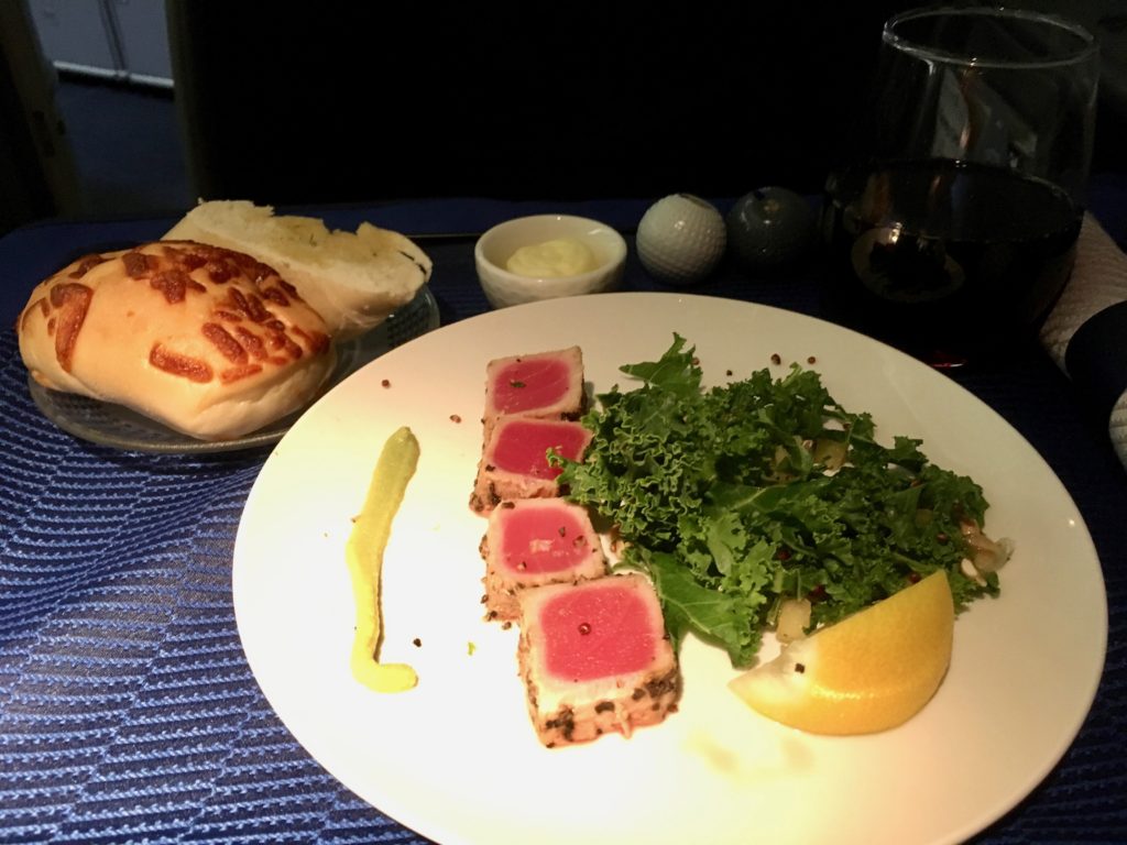 “Seared tuna, kale salad with apple and red quinoa, wasabi paste” – while the tuna looked appetizing it was absolutely flavourless, and the wasabi paste looked more like a baby turd. While better than some of United’s previous attempts at a business appetizer (like the single skewered prawn I got once) it still fell way short.
