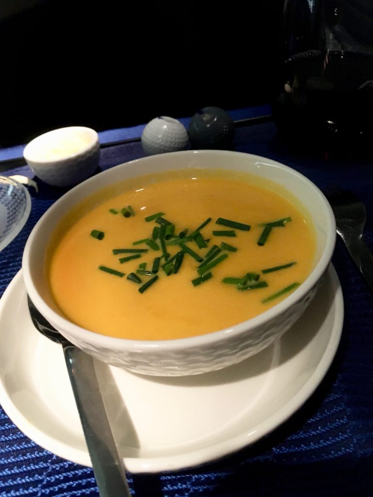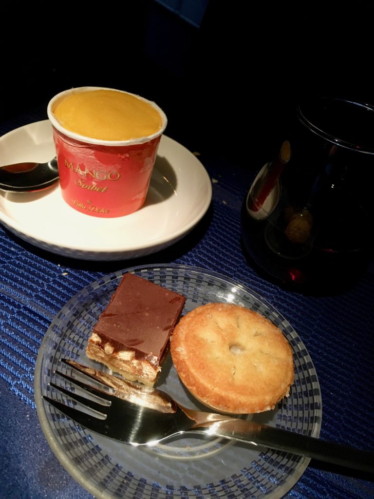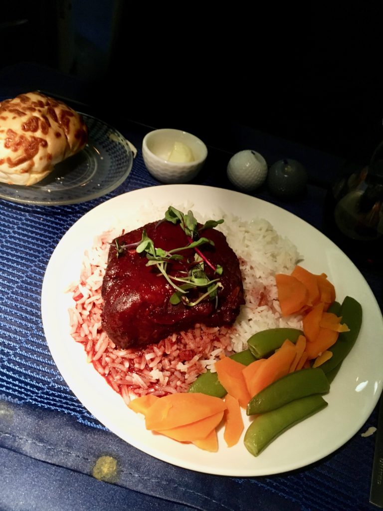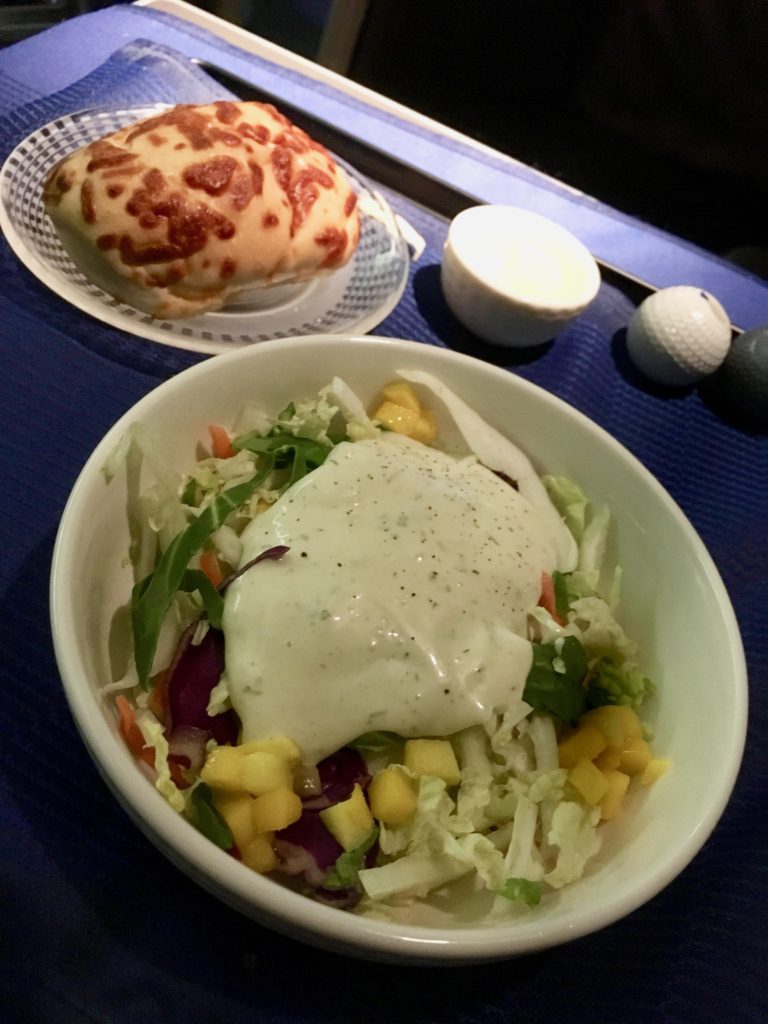 Salad of cabbage, bok choy, carrot, mango. Just…no. Who needs that much raw cabbage in flight. Nothing says first class like cheap shredded cabbage. Since they’re in this picture, I will note, I love the golf ball salt and pepper shakers in Polaris. Also in this picture which I hate: first class service ON A TRAY.