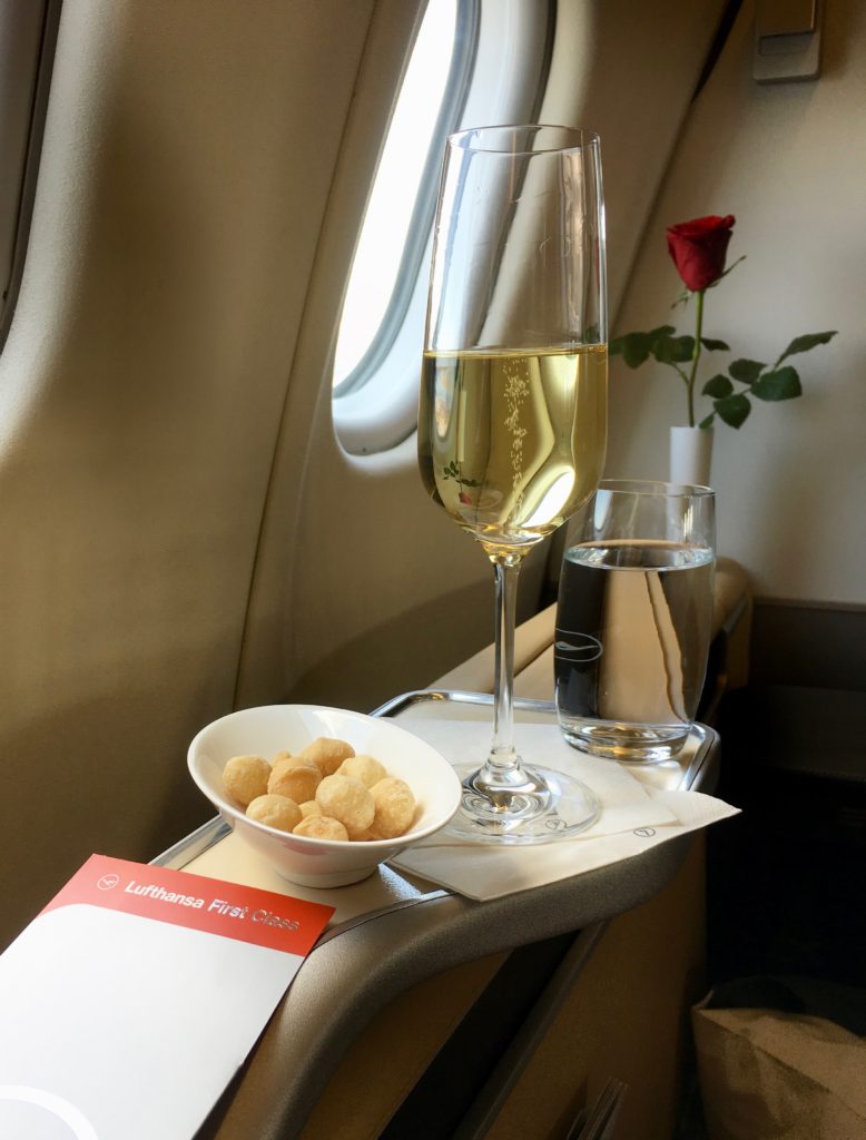Wow…champagne…and it’s with classy nuts, not in a plastic flute, and I get a rose. I love the little classy touches on Lufthansa.