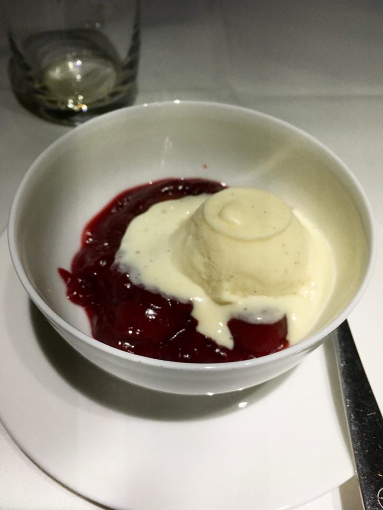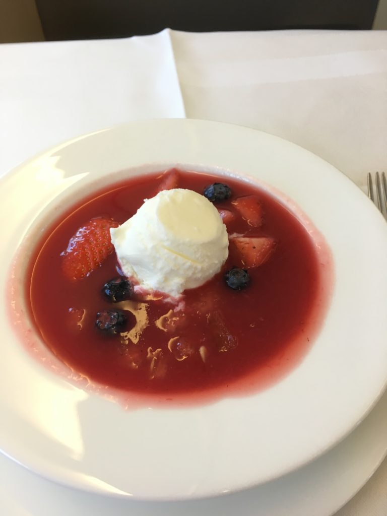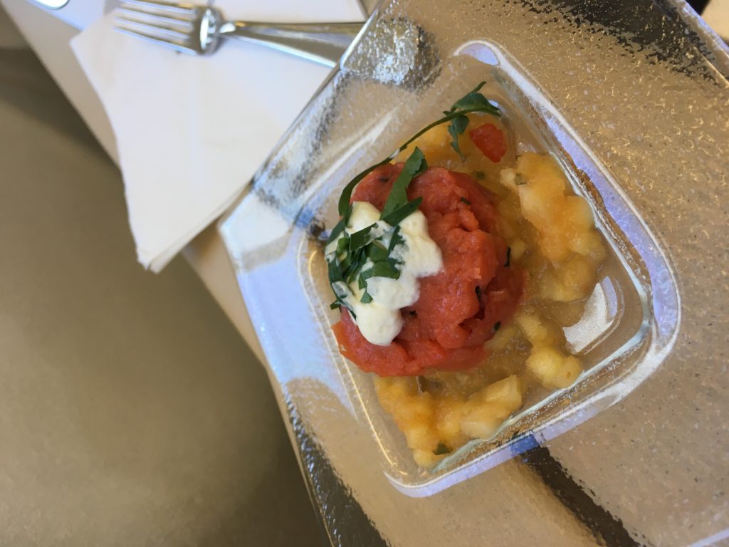 a bit unusual, but delicious: melon strawberry gazpacho with sour cream ice cream. It was so good I asked for more later in the flight, but alas it had all been eaten.