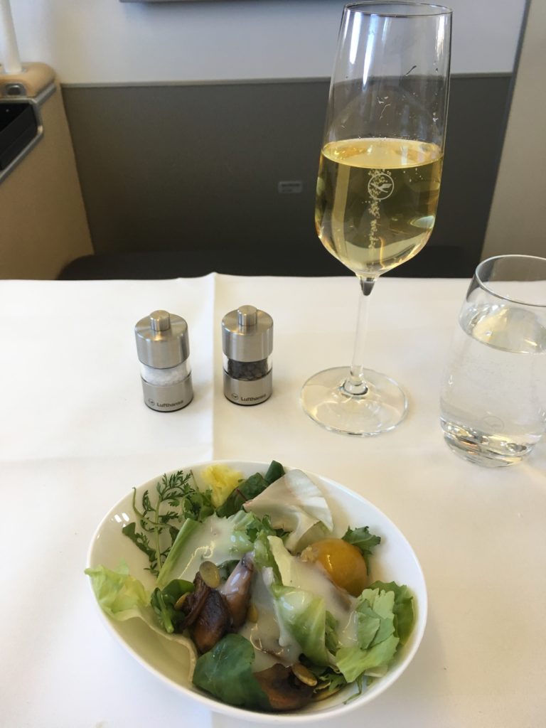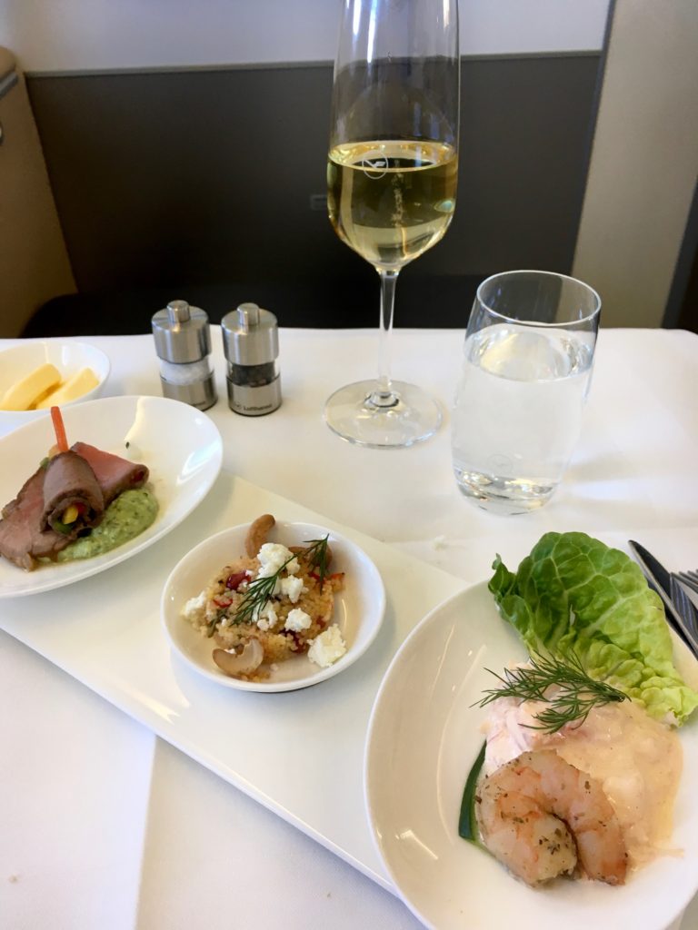 Lufthansa does an appetizer trio, and I admit that usually at least one of the appetizers is a little funky. Today was veal with turnip salad and wild garlic sour cream (super tasty), pomegranate couscous with feta and cashew nuts (also tasty), and the odd prawn cocktail. Odd because it was a single prawn with a creamy sauce that I understand is a german thing. Regardless, compare this (with caviar) with the tuna nightmare United served me, and you can do the maths.