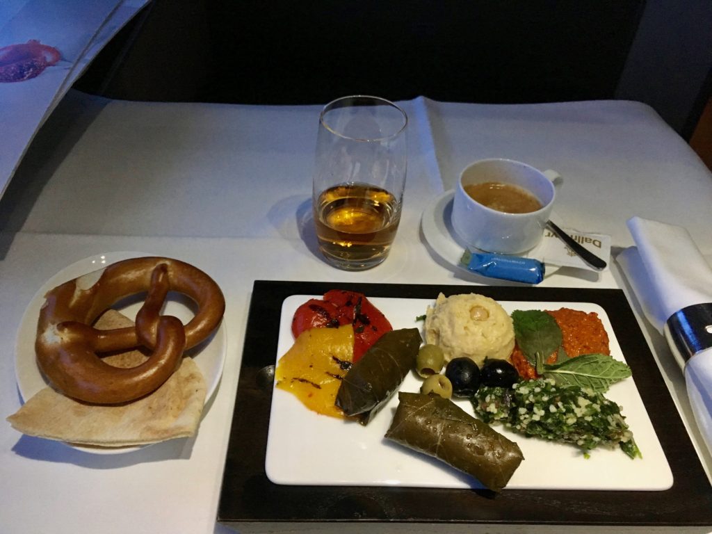 After a few hours of working, I was offered a mezze plate and pretzel before landing in Astana for our brief stopover. Accompanied with another double espresso and some Johnny Walker Blue of course.
