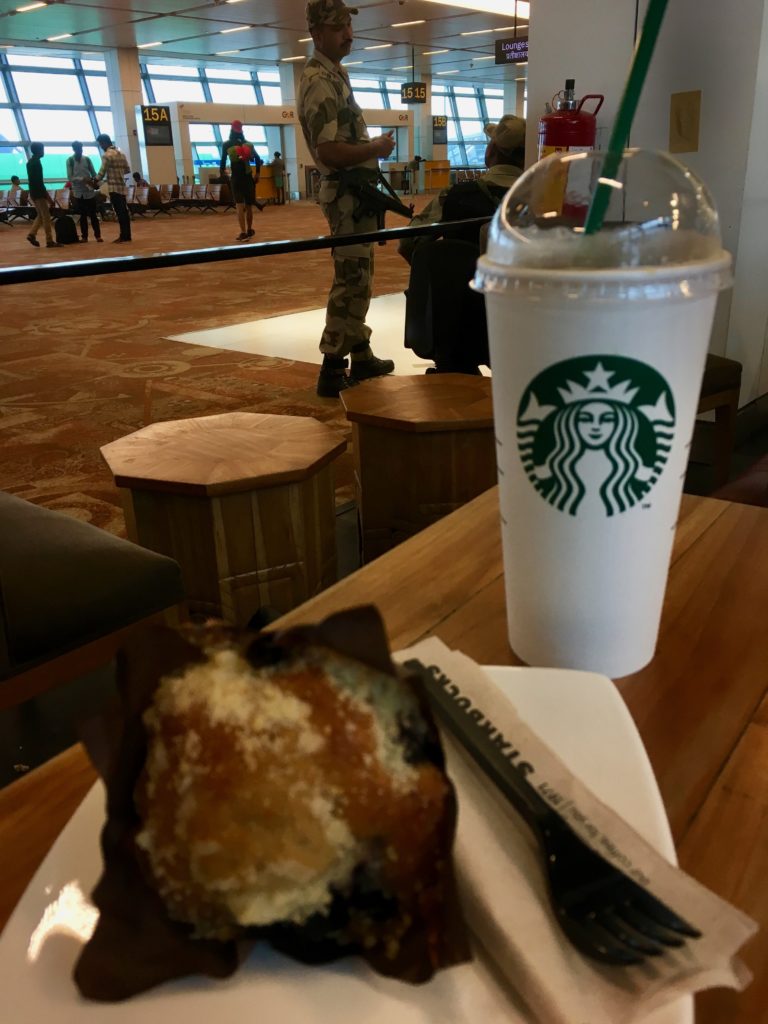 Since I was cutting it close, I opted to skip the lounge today (nothing to write home about in Delhi) and grab some Starbucks to wake me up. Best part of Delhi Airport is the Starbucks in the gate area…complete with heavily armed guard. Hands off my coffee!