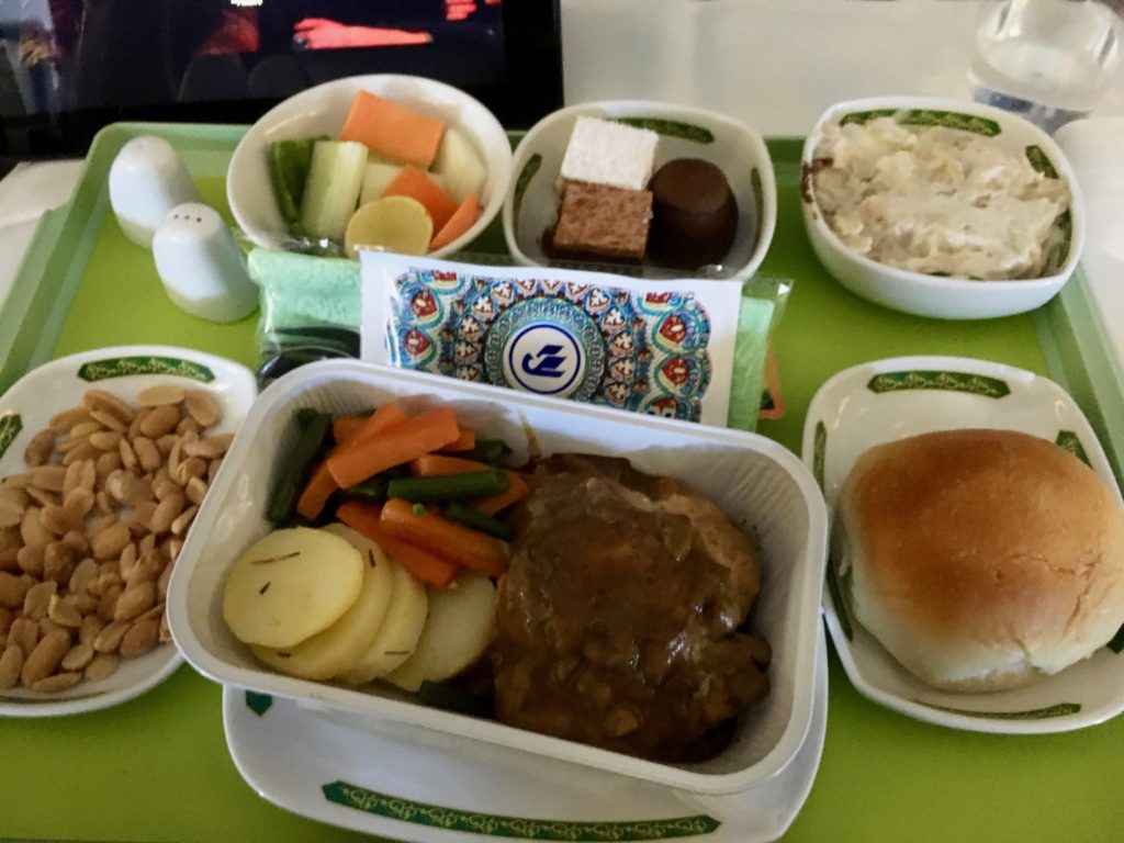 Dish of peanuts, “meat”, some veg, bread (on a plate), and some sort of potato or cabbage salad in heavy mayo. Wasn’t really the best meal, but I wasn’t all that hungry anyways, so picked at the parts that were interesting and that was plenty. It was a relatively short flight, so not a huge deal. Kudos to them for at least offering a hot meal on such a short flight.